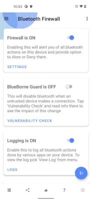 Wannan tsarin yana faɗakar da ku nan take idan wata manhaja ta gida ta yi yunƙurin ayyakan Bluetooth, ko kuma idan na'urori masu nisa suka haɗi ko suka haɗu da na'urarku. Har ma tana sanar da ku lokacin da aka shigar ko sabunta wata manhaja mai iyawar Bluetooth. Domin ƙarin tsaro, zaku iya saita Yanayin Tsanani da kuma kare katangar wuta da bayanan ta masu mahimmanci da kalmar sirri. Yanzu an ƙara fasalin adana na'urori da sunaye, inda katangar wuta za ta gane su yayin yunƙurin haɗi. Har ma kuna iya ganin lokacin da na'urar da aka ajiye ta haɗu da wani suna, yana ba ku ƙarin ikon sarrafawa akan haɗin ku.