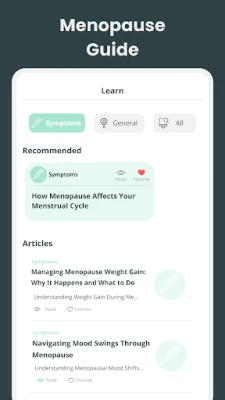 Domin cika bukatun lafiyarku, "Menopause Tracker App" tana gabatar da sabon tsarin abinci mai gina jiki. Ku gano abincin da ya fi dacewa don daidaita hormones, inganta metabolism, karfafa kasusuwa, da kuma inganta lafiyar jiki gaba daya. Ku bi tsarin abinci mai sauki don rage alamomin tsufa da kuma jin daɗi a kowace rana. Haka kuma, manhajar tana dauke da littattafai masu tushe daga binciken kimiyya, kowanne da nassoshin nazari. Ku kasance da cikakken sani a kan muhimman batutuwa—daga maganin hormones da abinci mai gina jiki, zuwa barci da kuma lafiyar tunani. Wannan cibiyar ilmi ce ta musamman, wacce ke tattara dukkan bayanan da kuke buƙata game da lafiyar jima'i, damuwa, barci, da kuma jin dadi gaba ɗaya, duka a cikin manhaja guda ɗaya mai sauƙin amfani.
