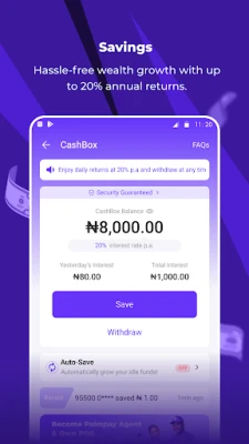 PalmPay wani dandali ne na kuɗi wanda ya samu amincewar miliyoyin 'yan Najeriya, yana mai ba da damar biyan kuɗi da canja wuri ba tare da wata wahala ba. Manhajar PalmPay tana ba ku damar buɗe asusu, sarrafa kuɗin ku, da gudanar da harkokin banki daban-daban cikin sauƙi. Ku ji daɗin ribar kashi 5% mai ban mamaki a kan kowane siyan data, tare da zaɓuɓɓukan tanadi masu sassauci waɗanda ke bayar da riba har zuwa kashi 20% a shekara. Mafi mahimmanci, cire kuɗi daga asusun ku a PalmPay kyauta ne koyaushe, kuma sabis na abokan ciniki yana nan a shirye 24/7 don taimaka muku.